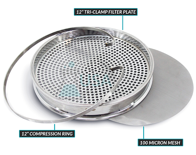 The USA Lab 12" filter plate kit allows users to place filtration media on top of the solid steel plate as well as the included 100 micron 150 mesh screen.