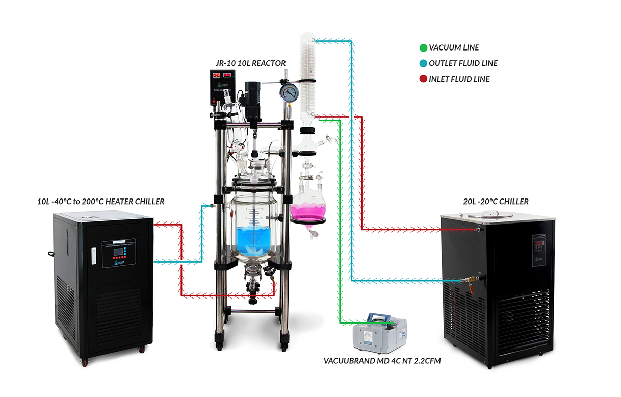 The USA Lab 10L Single Jacketed Glass Reactor turnkey system is the best reactor kit on the market. This kit comes with a USA Lab 10L UHC-10/40 Heater chiller that can bring your reactor down to a freezing temperature of -40°C and all the way back up to the high temperature of 200°C. This allows users to have accurate temperature control and a large range of temperature for a variety of applications. With each kit comes the MD 4C NT 2.2CFM Chemistry Diaphragm Pump, a top tier vacuum pump from Vacuubrand.